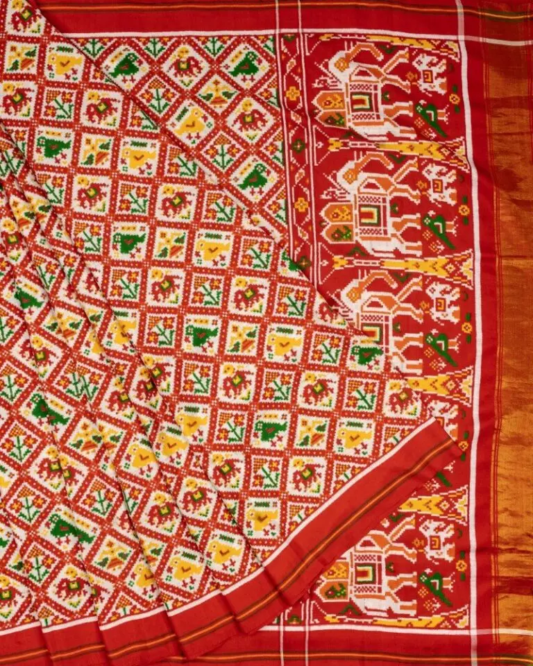 A Patola Saree is one of India’s most prized handwoven silk textiles, originating from Patan, Gujarat. The word “Patola” refers to the double ikat weaving technique – a labour-intensive process where both warp and weft silk threads are individually resist-dyed before weaving begins. This pre-planned precision is what creates the signature reversibility: a genuine Patola Saree looks identical on both sides.