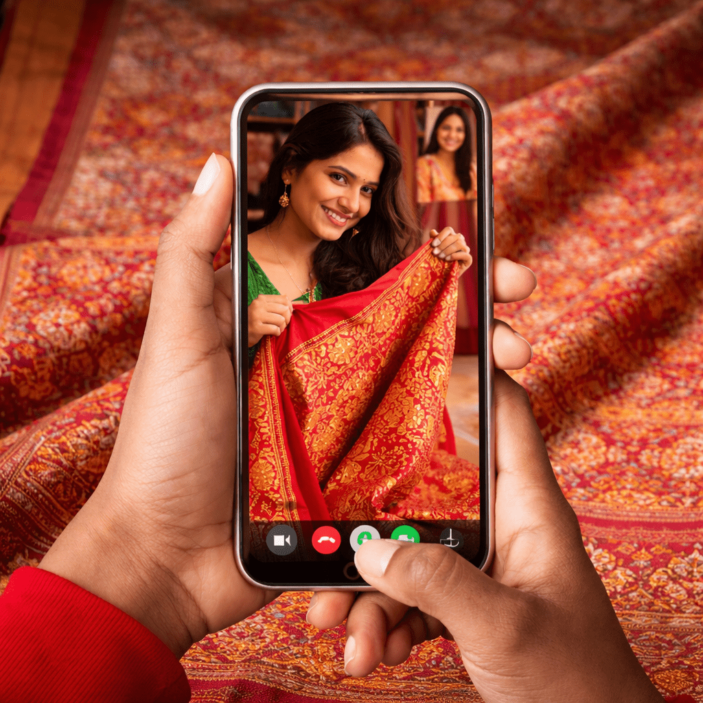 Discover the elegance of authentic Patan Patola through a personalized video consultation. Explore intricate details, vibrant colours, and timeless craftsmanship from the comfort of your home with our expert guidance.