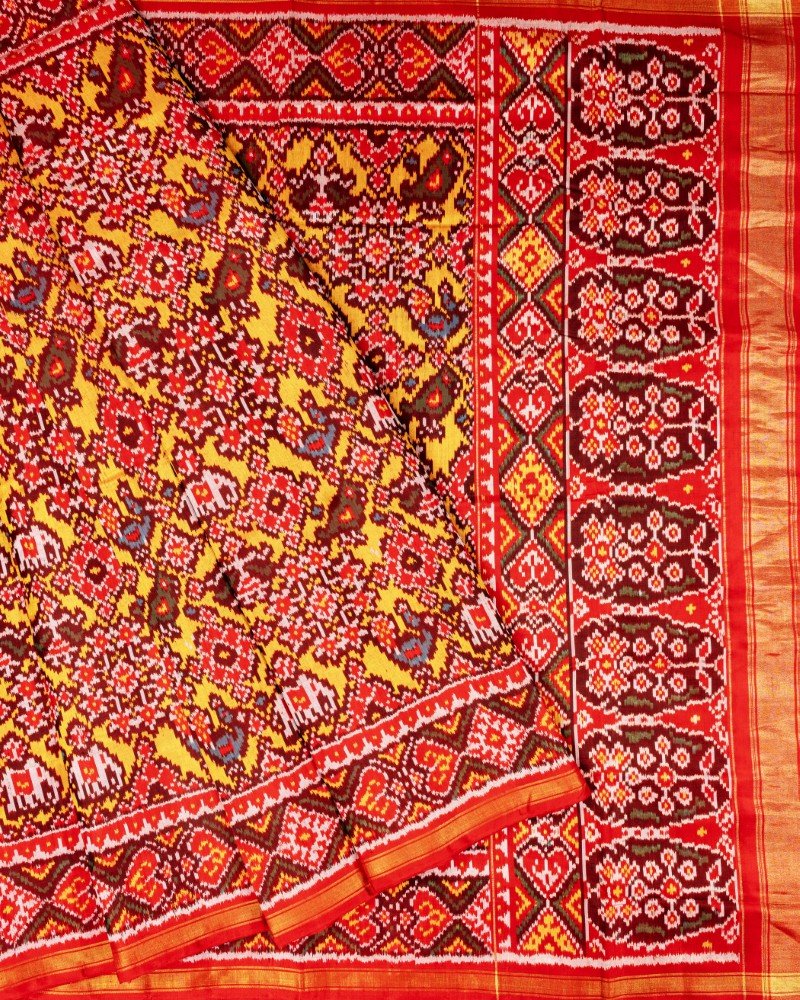 Crafted using the semi ikat technique, the saree showcases well-defined motifs with smooth colour transitions, reflecting the skilled artistry of Patola weavers. Enhanced with vibrant multicolour detailing and finished with a traditional red and gold zari border, this saree exudes regal elegance and timeless sophistication. Ideal for weddings, festive celebrations, and cultural occasions, it offers a harmonious fusion of heritage aesthetics and contemporary refinement.